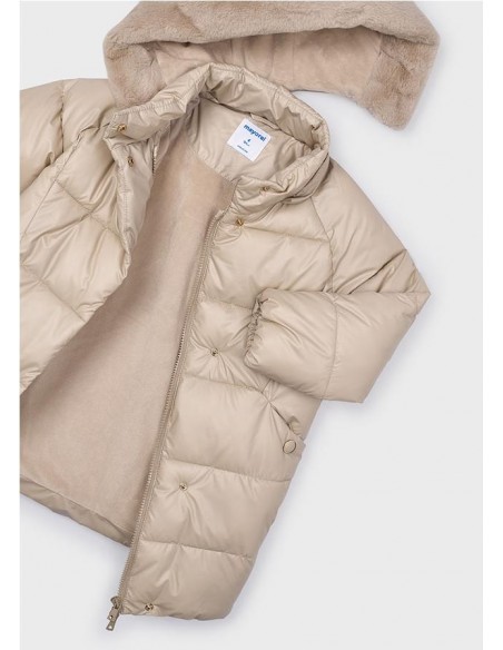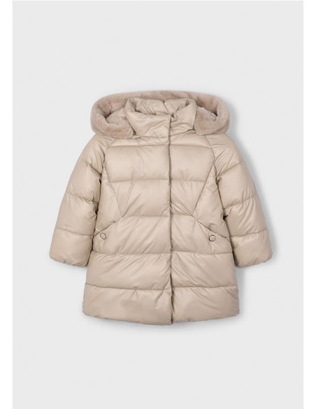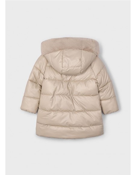 Contiene poliéster reciclado. Chaquetón de manga larga para niña con puños elásticos. Capucha desmontable con detalles de pelo. Diseño de corte largo. Cierre con botones en la parte delantera. Cierre central delantero con cremallera. Exterior textil con efecto acolchado. Suave forro interior de poliéster.