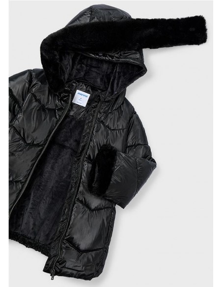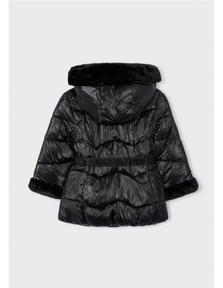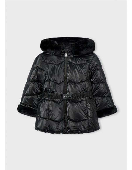 Contiene poliéster reciclado. Chaquetón de manga larga para niña. Capucha con detalles de pelo. Cierre central delantero con cremallera. Suave forro interior de poliéster. Acabado metalizado. Cinturón elástico con hebilla para niña que permite un ajuste personalizable y máxima sujección a la medida de la cintura.