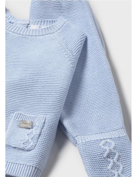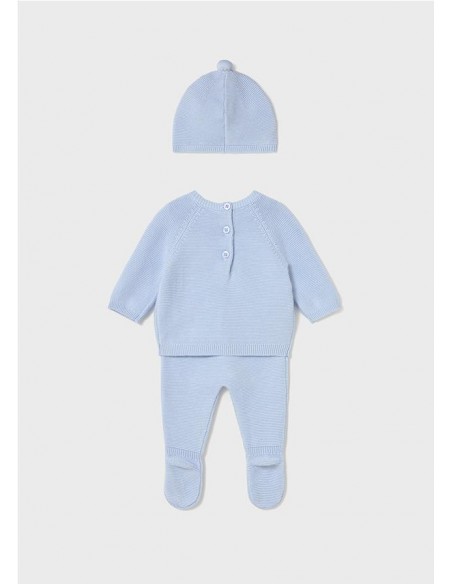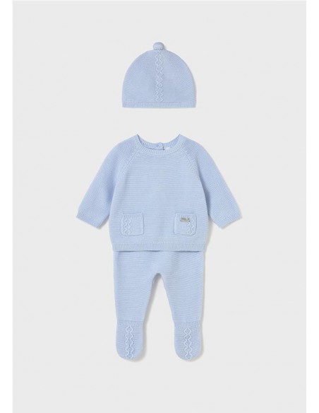 Original conjunto de tres piezas para recién nacido. Tejido de punto tricotosa de tacto suave y agradable. Jersey de manga ranglán para recién nacido. Cierre con botones en la espalda para facilitar la puesta de la prenda. Bolsillos funcionales en la parte delantera. Elementos de adorno: detalles trenzados. Pantalón con pies tipo polaina. Cinturilla elástica. Elementos de adorno: detalles de canalé. En este modelo las tallas mayores (de 6-9 a 18 meses) no llevan pies.